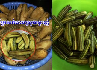 -ដាក់ស្ងោរអោយផុយស្បែក-ស្រង់ឡើងរួចប្រឡាក់អំបិល អោយប្រៃល្មម ទុកចោល ប្រហែលកន្លះម៉ោង
