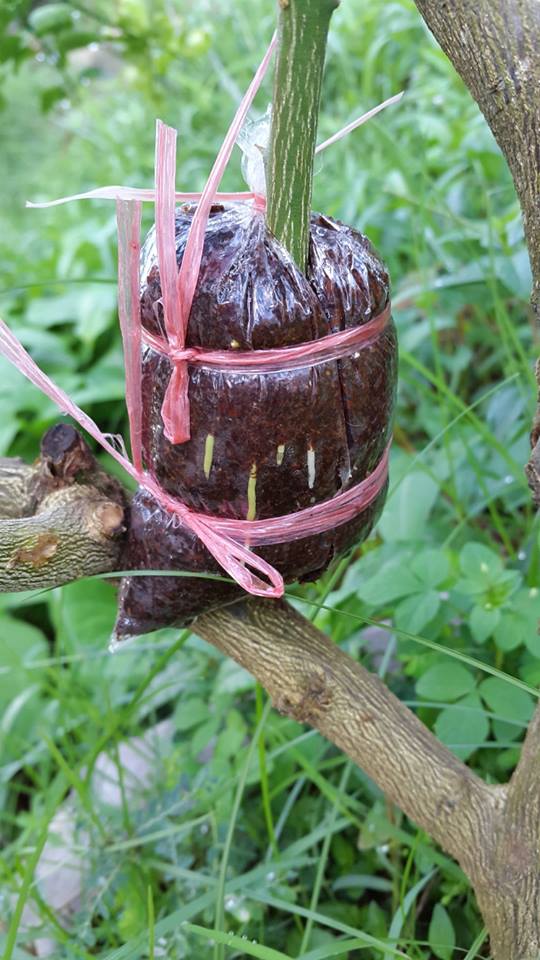 – យកដីដែលមានជីវជាតិ លាយជាមួយជីធម្មជាតិស្ងួតយកមកច្រកថង់រួចវះចងផ្អោបជុំវិញកន្លែងដែលចិតសំបកនោះ (ត្រូវលាបថ្នាំជំនួយឬសផង) រួចត្រូវផ្តល់ទឹកឲ្យវាសើមជាប់ជានិច្ច