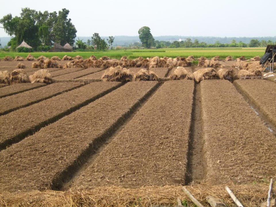 – បន្ទាប់មក កាប់លើកជារងដែលមានទទឹង ១ ម៉ែត្រ បណ្តោយទៅតាមស្ថានភាពដី និងកំពស់ ២,៥ តឹក – នៅលើរងនិមួយៗ ត្រូវដាក់ជីលាមកសត្វពុកផុយទ្រាប់បាត