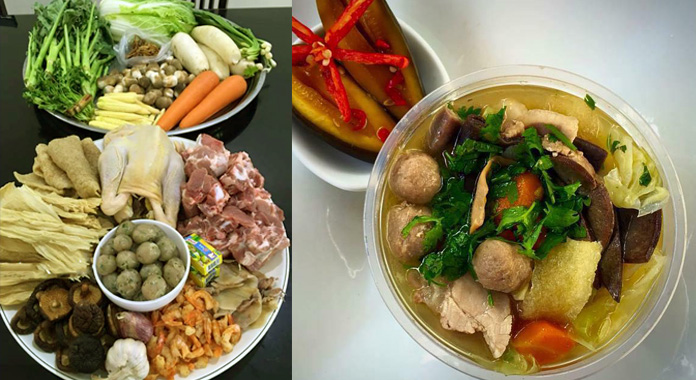 8.ដាក់ឆ្នាំងដាំឱ្យក្តៅ ចាក់ប្រេងឆាចូល រួចដាក់ខ្ទឹមចិញ្ច្រាំចូល រួចលីងឱ្យឈ្ងុយបន្តិច ទើបចាក់ទឹកត្រីចូល រួចដាក់ឆ្អឹងជ្រូកចូល ដាក់អំបិល ស្ករ ប៊ីចេង ម្សៅស៊ុប កូរឱ្យសព្វ ចាក់ទឹកបន្តិច ប្រហែល ៥ នាទី ទើបដាក់ស្បែកជ្រូក និងផ្សិតត្រចៀកកណ្តុរ និង បន្លែដើមខាត់ណា ការ៉ុត ឆៃថាវ និង ដំឡូងបារាំងចូលជាមួយគ្នាតែម្តង រំងាស់ឱ្យឆ្អឹង និង បន្លែនោះផុយបន្តិច (រំងាស់ដំបូងចាក់ទឹកបន្តិចម្តងៗ) ប្រហែល ២០ នាទី ទើបចាក់ទឹកឱ្យច្រើនតែម្តង។ ហើយរំងាស់វាឱ្យពុះម្តងទៀត ភ្លក់មើលឱ្យល្មម ទើបដាក់ស្ពៃបូគោ ស្ពៃក្តោប និងស្លឹកខាត់ណាចូលមួយពុះ រួចដួសដាក់ចាន រោយស្លឹកខ្ទឹម និងជីវ៉ាន់ស៊ុយពីលើជាការស្រេច៕(មានវិដេអូខាងក្រោម)