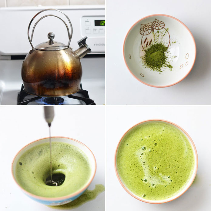 – ដាក់តែបៃតង ១ ស្លាបព្រាកាហ្វេចូលទៅក្នុងទឹកក្តៅមួយពែង