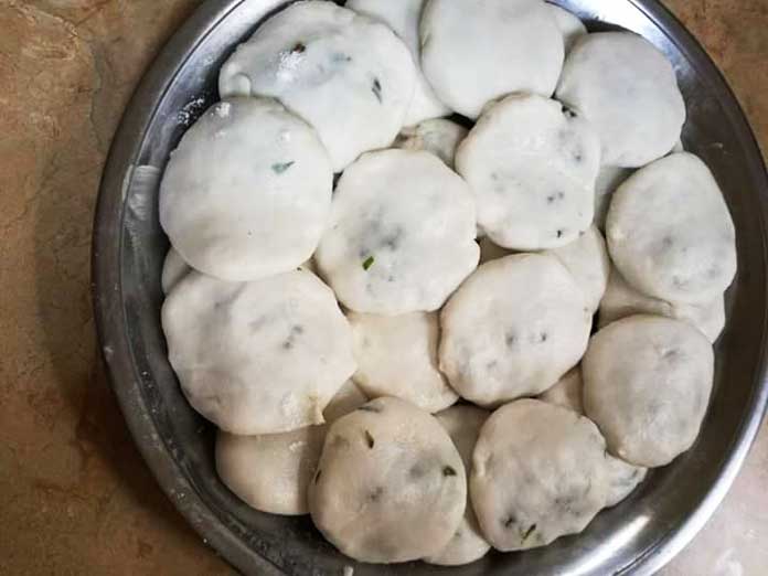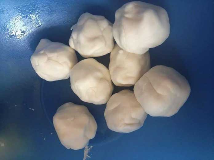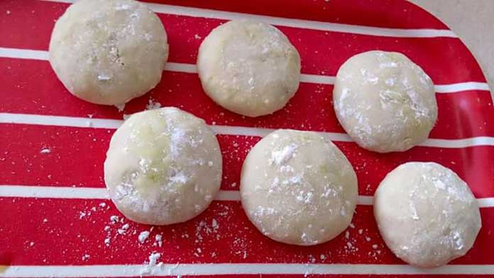 ៣- យកម្សៅដែលលាយហើយ មូលជាដុំតូចៗល្មម រួចរោយម្សៅមីបន្តិចលើជ្រុញដើម្បីកុំពេលកិនវាស្អិត រួចកិនដុំម្សៅ អោយសម្ពៀតៗ ទាំងអស់។