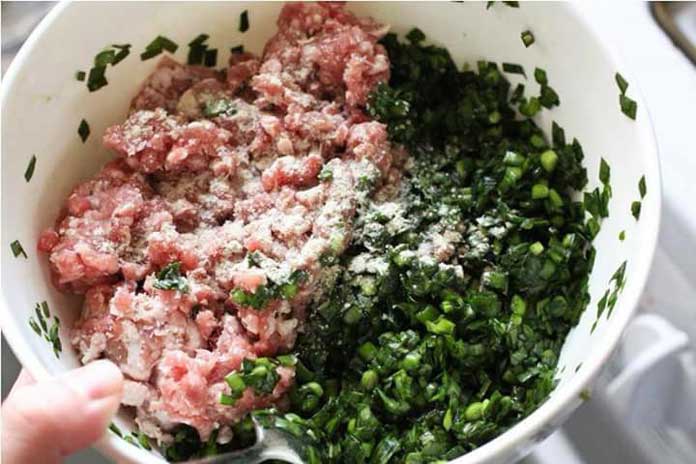 ២- ស្លឹកគូឆាយ សាច់ជ្រូក បង្គាស្រស់ លាយបញ្ចូលគ្នារួចដាក់