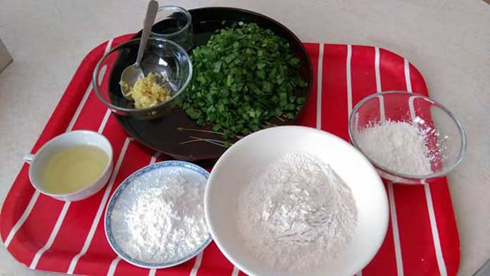 ១- លាយម្សៅបញ្ចូលគ្នា ដាក់ស្ករស អំបិល ប្រេងឆា ទឹក រួចច្របល់លាយគ្នាអោយសព្វល្អ ទុកមួយអន្លើ។