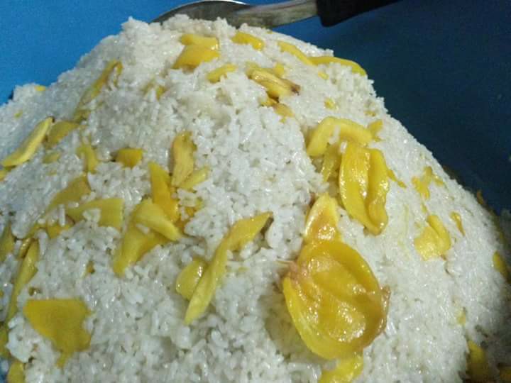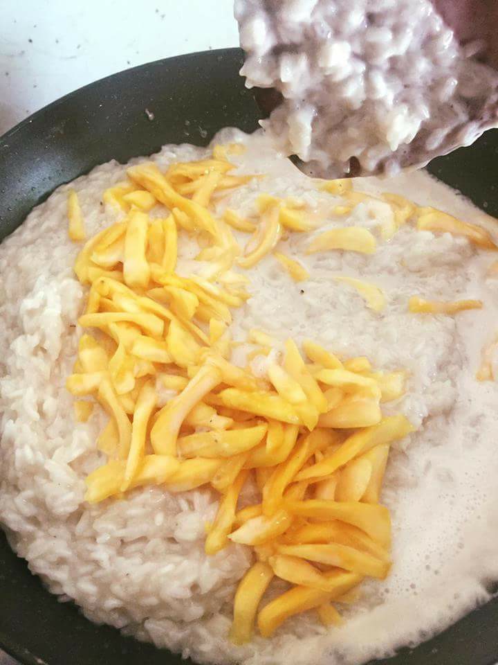 ២. យកអង្ករ សាច់ដូងកោស, អំបិល និងស្ករសដាក់ចូលកូរឲ្យវារលាយស្ករប្រហែលជា ៥នាទី។