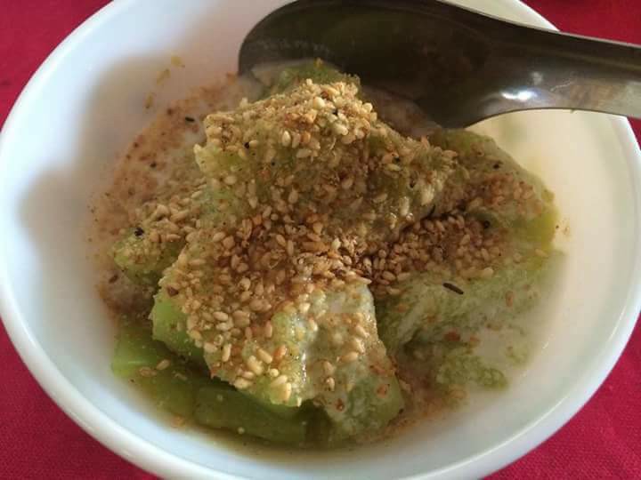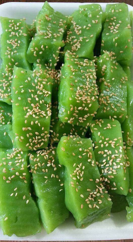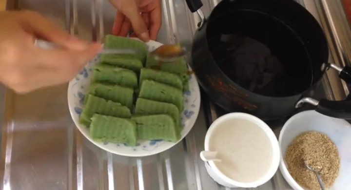 ៤. បន្ទាប់ពីនំបានត្រជាក់យកមកកាត់ជាដុំៗ តាមដែលចង់បាន ហើយយកវាមកញ៉ាំជាមួយទឹកស្ករ និងខ្ទិះដូងរោយល្ងរដាក់ពីលើ។