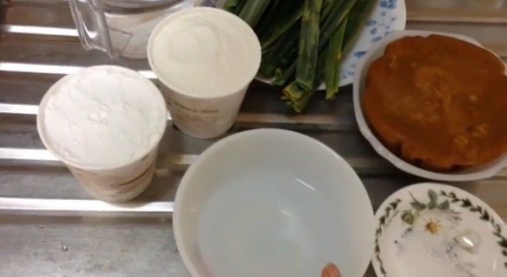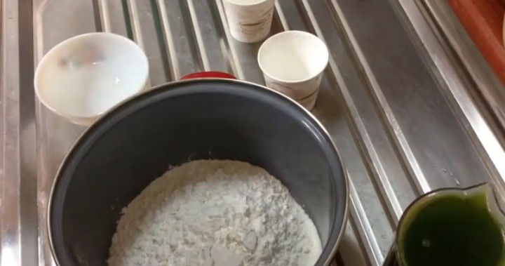១. ដំបូងយកឆ្នាំងមកដាក់ម្សៅអង្ករ, ម្សៅឆា, អំបិល និងទឹកស្លឹកតយ រួចកូរចូលគ្នាឲ្យសព្វ។