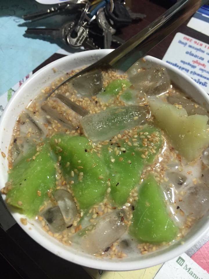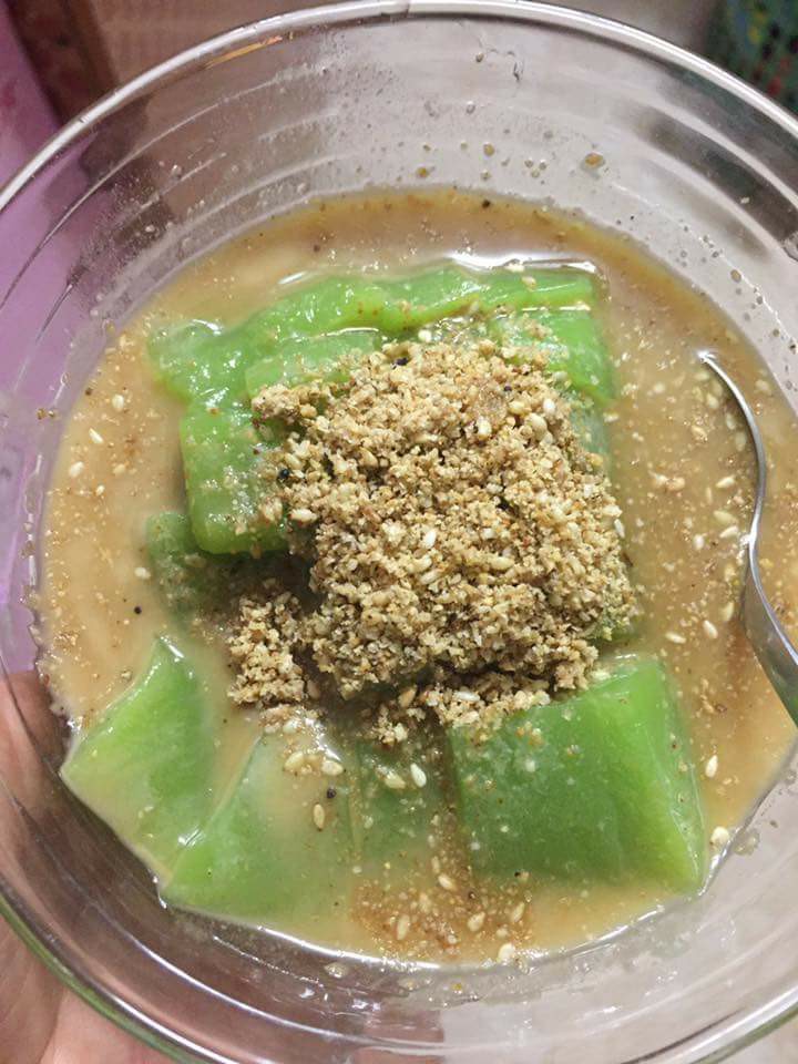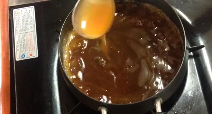 ស្ករត្នោត ៤៥០ក្រាម, ទឹក ៣៦០មីលីលីត្រ, អំបិល បន្តិច, ខ្ញី ១ដុំចិតបន្ទះៗ ដាក់ចូលក្នុងឆ្នាំងទាំងអស់ ដាក់ដាំឲ្យពុះបន្ថែម ម្សៅឆា ១ស្លាបព្រាបាយ កូរវាបន្តិចទៀតជាការស្រេច។