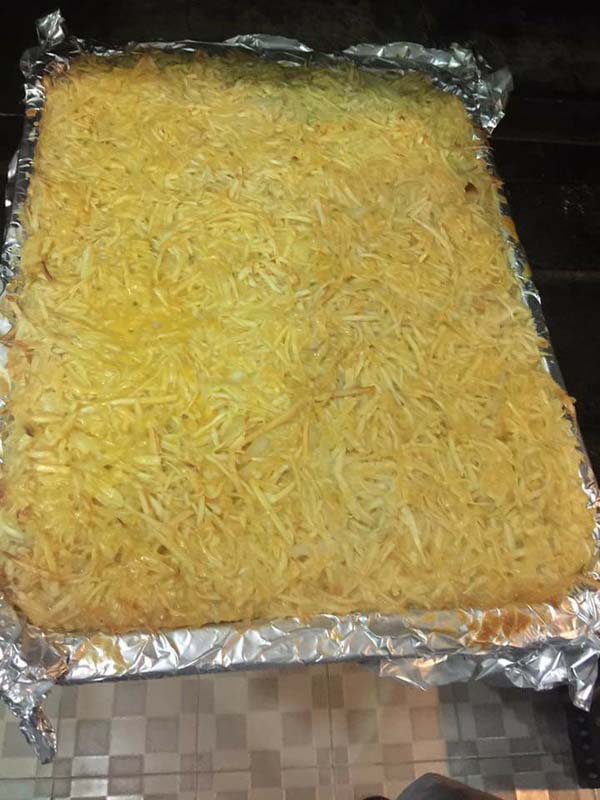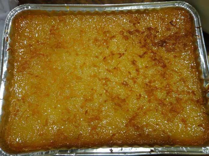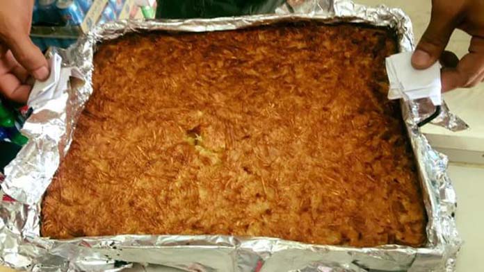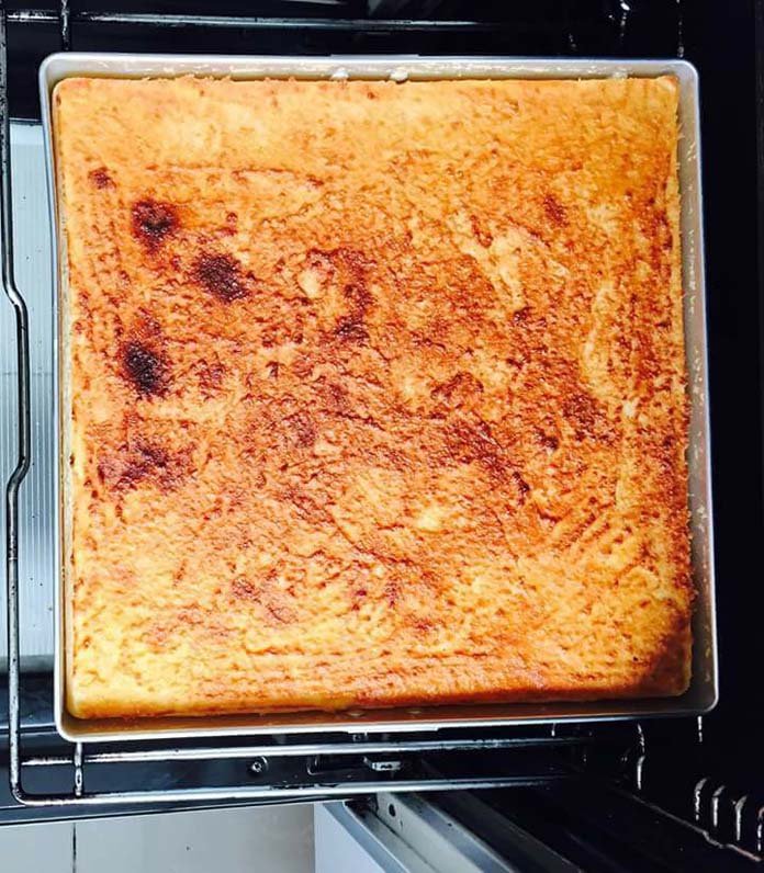 ២. នៅពេលដែលកូរសព្វហើយ ត្រូវយកវាទៅចាក់ចូលក្នុងថាសសម្រាប់ដុតនំ វាសឲ្យស្មើ ឬសំភារៈអ្វីផ្សេងដែលមានផ្ទៃរាបដូចទៅនិងថាស រួចយកវាទៅដាក់ចូលក្នុងឡដុតនំ។