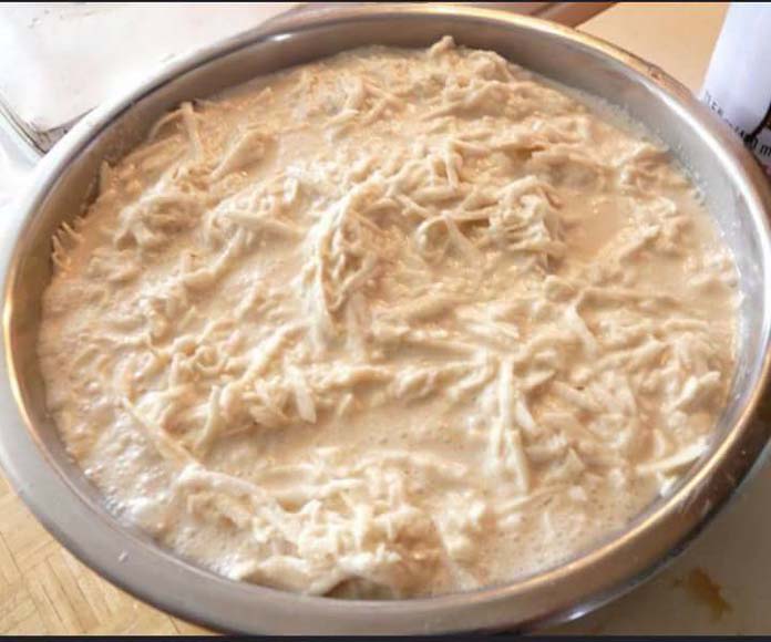 ១. ដំបូងអ្នកត្រូវយកដំឡូងដែលបានឈូសរួចមកលាយជាមួយស្ករស, អំបិល, សាច់ដូង, ទឹកដោះគោ, ខ្ទិះដូង និងគោះពងទាដាក់ រួចកូរវាបញ្ចូលគ្នាទាំងអស់។