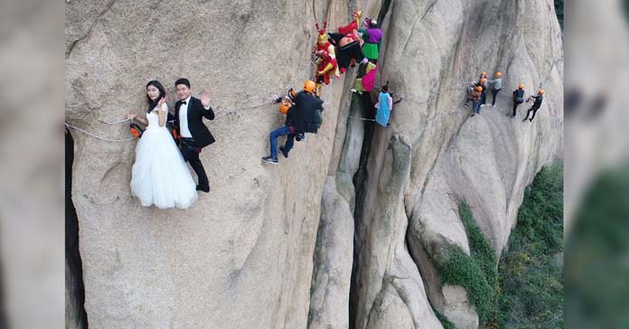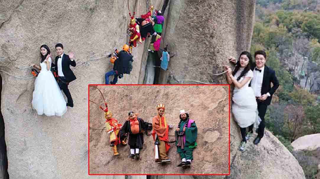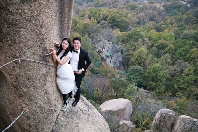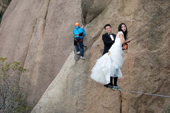 អ្នកដែលទើបតែរៀបការថ្មីនេះបានសន្យាថានឹងស្រលាញ់គ្នានិងកាន់ដៃគ្នាឲ្យតឹងដូចនៅក្នុងរូបថតអាពាហ៍ពិពាហ៍របស់ពួកគេខណៈពេលដែលកំពុងកាន់ខ្សែយីយោងៗនៅលើច្រាំងថ្មមួយ។