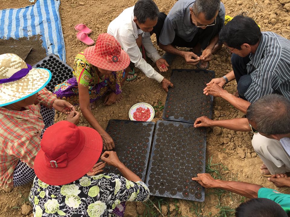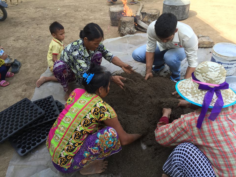 – ដាក់ល្បាយដីដែលបានលីងនោះទៅក្នុងថាសបណ្តុះ (មិនត្រូវ សង្កត់ដីក្នុងថាស់បណ្តុះអោយហាប់នោះទេ)