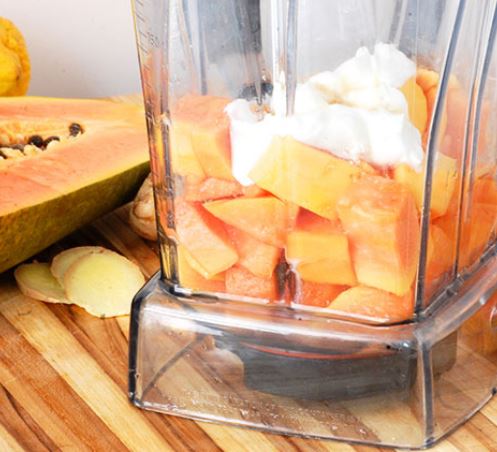 – ហាន់ល្ហុងជាចំណិតតូចៗ/chop the slice of papaya into pieces and put into a blender