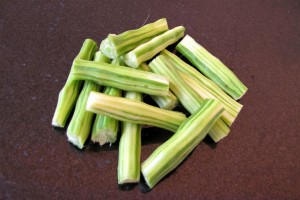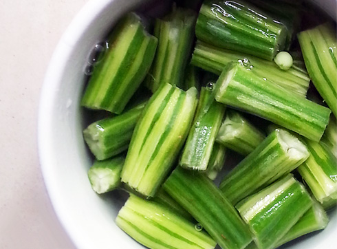 – បកសំបកផ្លែម្រុំហើយហាន់ជាចំណិតតូចៗ/peel the moringa pod than chop it into small pieces