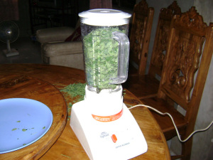 – ដាក់ស្លឹកម្រុំចូលម៉ាស៊ិនក្រឡុកហើយបន្ថែមទឹក នឹងក្រឡុកឱ្យបានល្អ/blend moringa leave with 235ml of water in a blender at high speed