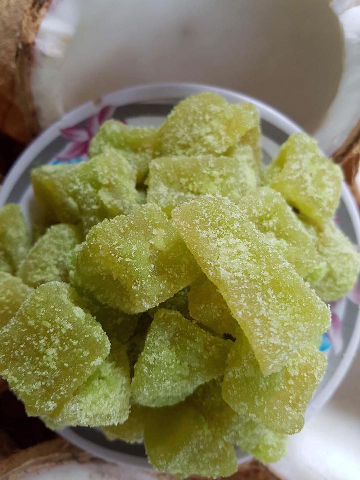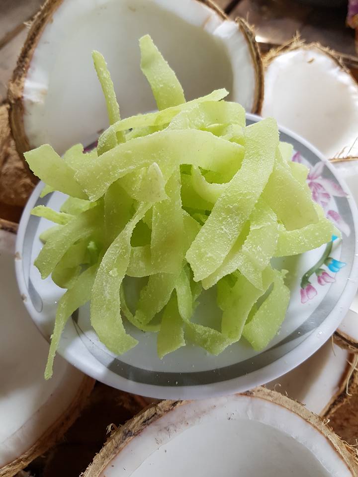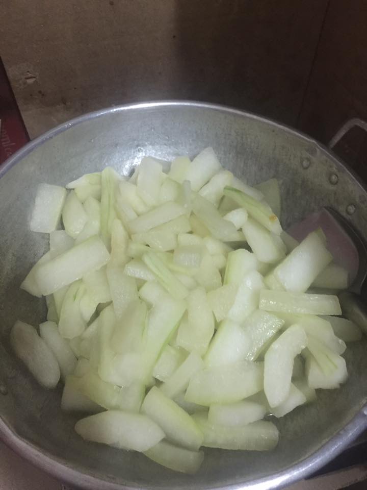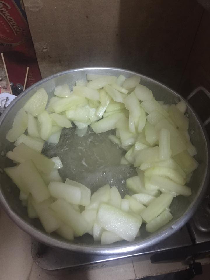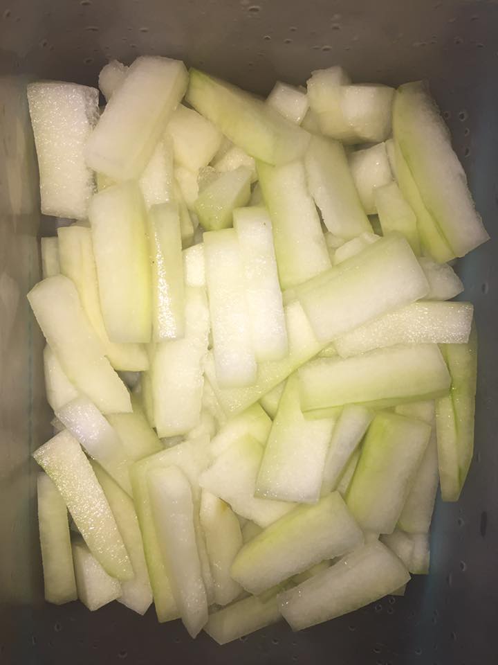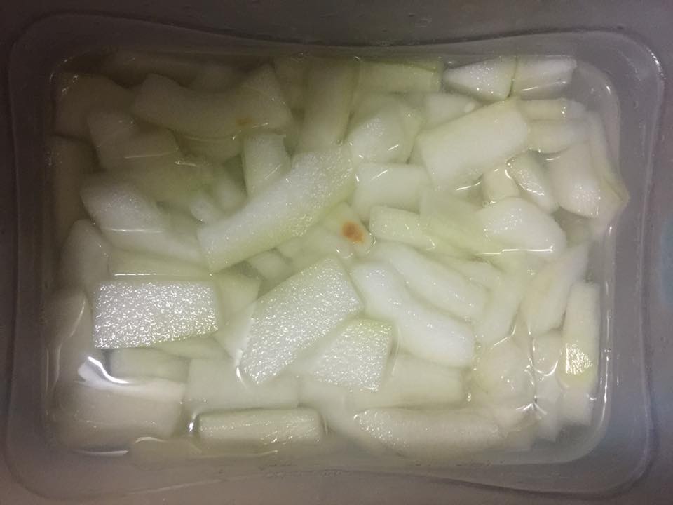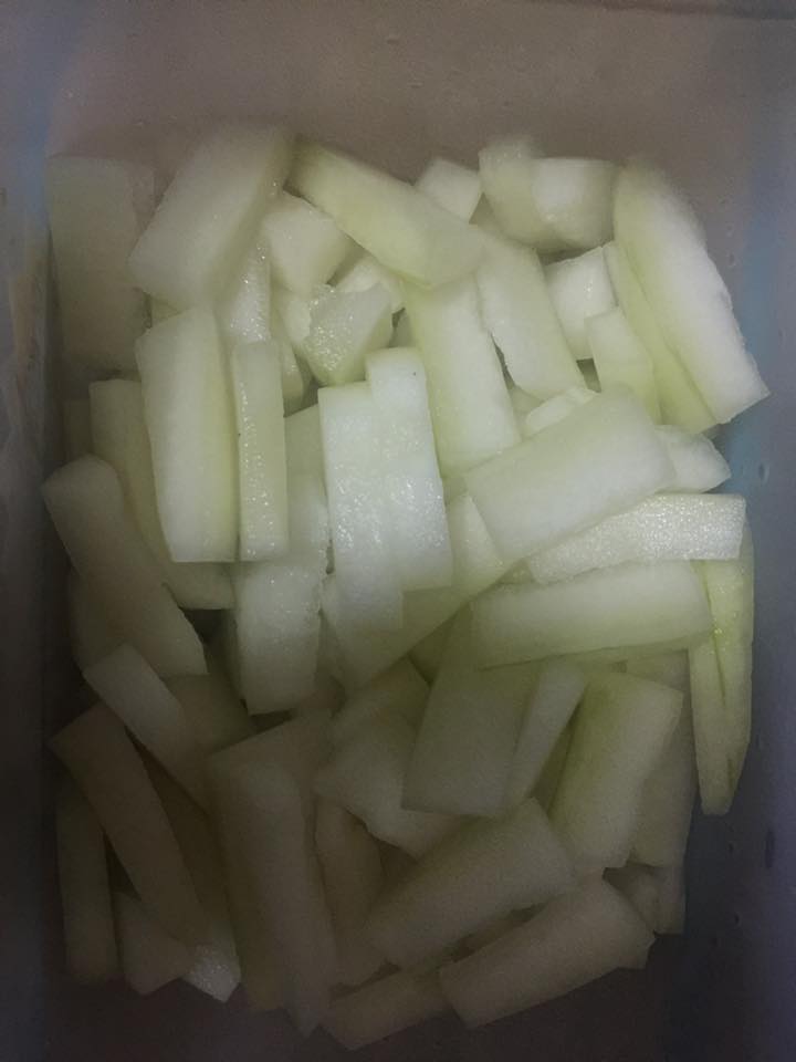 ២ . បន្ទាប់ពីធ្វើការហាន់ជាបន្ទះៗរួចមក អ្នកគួរតែដាក់ត្រាំទៅក្នុងទឹក ដែលមានបន្ថែមនូវកំបោរស រយៈពេលមួយយប់។
