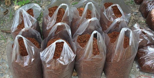 -ថង់ដាក់ល្បាយស្រកីដូង លាយជាមួយកំទេចស្លឹករុក្ខជាតិខ្លះ។