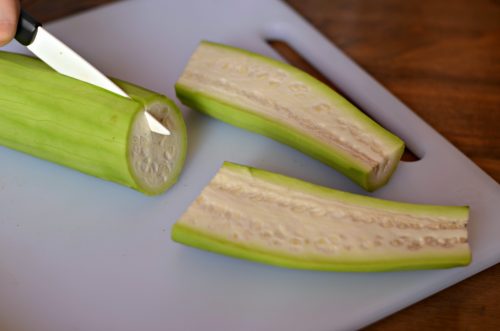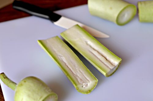 – បកសំបកត្រឡាច នឹងយកគ្រាប់ចេញហើយហាន់ទៅចំណិតតូចៗ/peel and remove the seed from the gourd than chop into small pieces