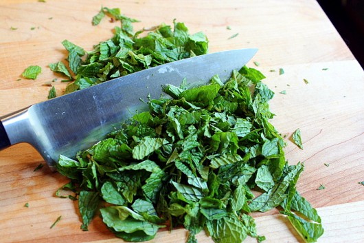 – ដាក់ត្រឡាចនឹងជីអង្កាមចូលម៉ាស៊ីនក្រឡុក/put the chopped gourd into a blender and add in mints leaves