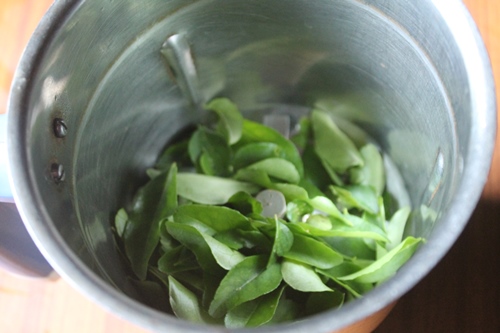 – ដាក់ស្លឹកកន្រូបចូលម៉ាស៊ីនក្រឡុក/add curry leaves into a blender