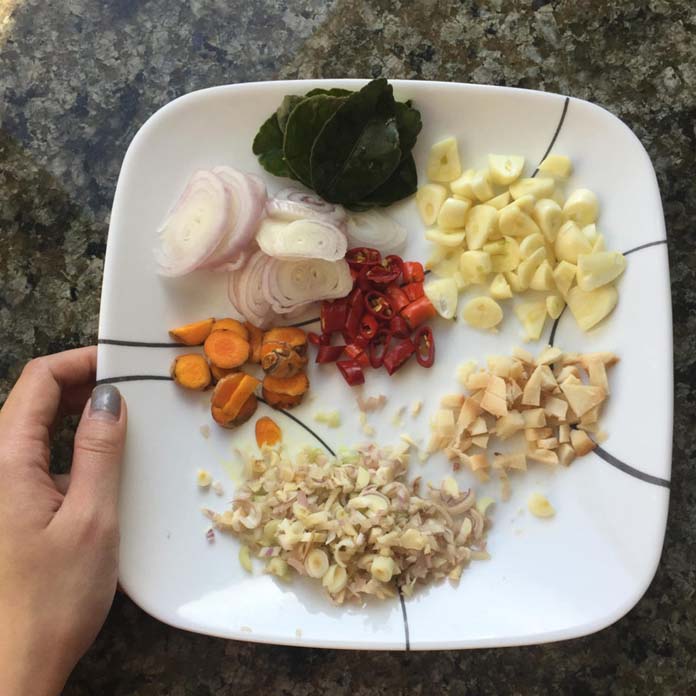 -គ្រឿងបុក ៣ស្លាបព្រាបាយ (គល់ស្លឹកគ្រៃ រមៀត រំដេង ស្លឹកក្រូចសើច ខ្ទឹមស បុកចូលគ្នា)