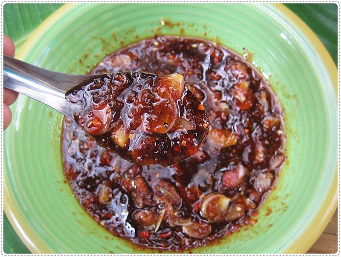 គ្រឿងផ្សំ៖ កាពិ ១ស្លាបព្រាបាយ, ទឹក ១០០មីលីលីត្រ, ស្ករត្នោត ៥០០ក្រាម, ទឹកត្រី ៤ស្លាបព្រាបាយ, អំបិល កន្លះស្លាបព្រាកាហ្វេ, ខ្ទឹមក្រហម ហាន់ស្តើងៗ កន្លះកូនចាន, ម្ទេសហាន់តូចៗ (តាមចំណងចំណូលចិត្ត), បង្គាក្រៀម បុកឲ្យម៉ត់ល្មម កន្លះកូនចាន, បង្គាក្រៀម កន្លះកូនចាន, ម្ទេសហុយ ១ស្លាបព្រាកាហ្វេ។ វិធីធ្វើ៖ ដាក់ខ្ទះឲ្យក្តៅ រួចដាក់ទឹក និងស្ករត្នោតចូលកូរឲ្យរលាយ។