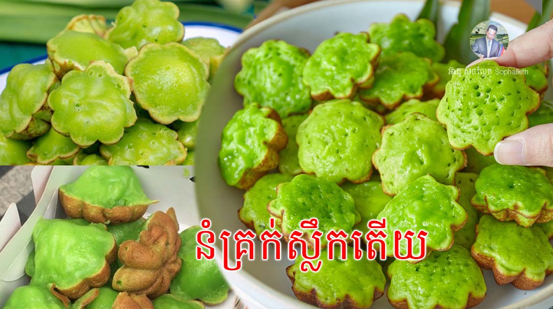 គ្រឿងផ្សំ៖ ម្សៅស្រូវសាលី ៦៥ក្រាម, ម្សៅមី ៣០ក្រាម, ម្សៅដុតនំ (Baking Powder) កន្លះស្លាបព្រាកាហ្វេ, ទឹកស្លឹកតើយ ៥-៦ស្លាបព្រាបាយ, ខ្ទិះដូង ៦៥ក្រាម, ស្ករស ៦០ក្រាម, អំបិល ១ចុងស្លាបព្រាកាហ្វេ, ប្រេងសណ្តែក ៣០ក្រាម, ស៊ុត ១គ្រាប់។ វីធីធ្វើ៖ យកចានលាយម្សៅស្រូវសាលី ម្សៅមី ម្សៅសម្រាប់ដុតនំ (Baking Powder) ឬម្សៅមេនំបុ័ង ស្ករស អំបិលចូលគ្នាកូរឲ្យសព្វ។ បន្ទាប់មកគោះស៊ុតដាក់ចូល ដាក់ប្រេងសណ្តែក និងទឹកស្លឹកតើយចូល កូរចូលគ្នាឲ្យសព្វ រួចយកទៅច្រោះកុំឲ្យដោយកាក។