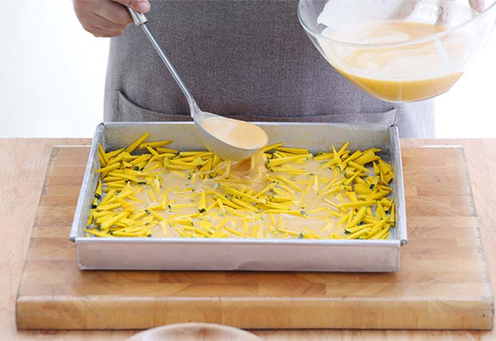 យកល្ពៅរៀបដាក់ចាន ដែលត្រូវចំហុយ រួចដួសគ្រឿងដែលលាយហើយដាក់ចូល ហើយយកទៅដាក់ចំហុយប្រហែល ១៥-២០នាទី ឆ្អិនយកមកកាត់ជាដុំហូប ជាការស្រេច៕ ចុចមើលវីដេអូពីវិធីធ្វើនៅខាងក្រោម៖
