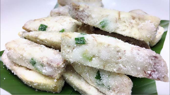 គ្រឿងផ្សំ៖ ត្រាវ ១គីឡូ, ស្ករស ៤០០ក្រាម, ទឹកឆ្អិន ៤ស្លាបព្រាបាយ, អំបិល កន្លះស្លាបព្រាកាហ្វេ, ស្លឹកខ្ទឹម ហាន់ល្អិត, ស្លឹកតើយ (ដាក់ក៏បានមិនដាក់ក៏បាន)។ វិធីធ្វើ៖ យកត្រាវចិតសំបកលាងទឹកឲ្យស្អាត រួចកាត់ជាដុំ ឬវែងល្មម តាមចំណង់ចំណូលចិត្ត។ រួចយកត្រាវទៅបំពងជាមួយស្លឹកតើយចូល បំពងឲ្យក្រៀមល្មម រួចស្រង់ទុកមួយឡែក។