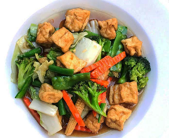 គ្រឿងផ្សំ៖ តៅហ៊ូ ២-៣ដុំ, បន្លែមាន ការ៉ុត ស្នៀតពោត ផ្កាខាត់ណា សណ្តែកបារាំង មួយមុខ ៣០ក្រាម, ខ្ទឹមសចិញ្រ្ចាំ ២ស្លាបព្រាបាយ, ទឹកស៊ីអ៊ីវ ១ស្លាបព្រាបាយ, ទឹកប្រេងខ្យង ២ស្លាបព្រាបាយ, ស្ករស ១-២ស្លាបព្រាកាហ្វេ, ម្រេចម៉ត់ ១ស្លាបព្រាកាហ្វេ, ស្លឹកខ្ទឹមហាន់។