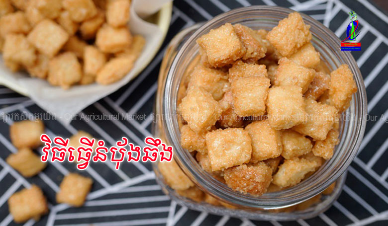 ១.យកនំបុ័ងកាត់ជាដុំតូចល្មម រួចយកទៅអាំង ឬចៀនឲ្យក្រៀមល្មម រួចដាក់ទុកមួយឡែក