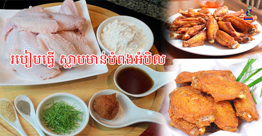 +គ្រឿងផ្សំ៖-ស្លាបមាន់ (ផ្នែកកណ្តាល) ៣ខាំកន្លះ-ម្សៅបំពង ៥ស្លាបព្រាបាយ-អំបិល ២ស្លាបព្រាកាហ្វេ-ប្រេងខ្យង ១ស្លាបព្រាបាយ-ទឹក ៥ស្លាបព្រាបាយ-គល់ស្លឹកគ្រៃ ហាន់ប្រឆិតៗខ្លីល្មម ស្លឹកក្រូច