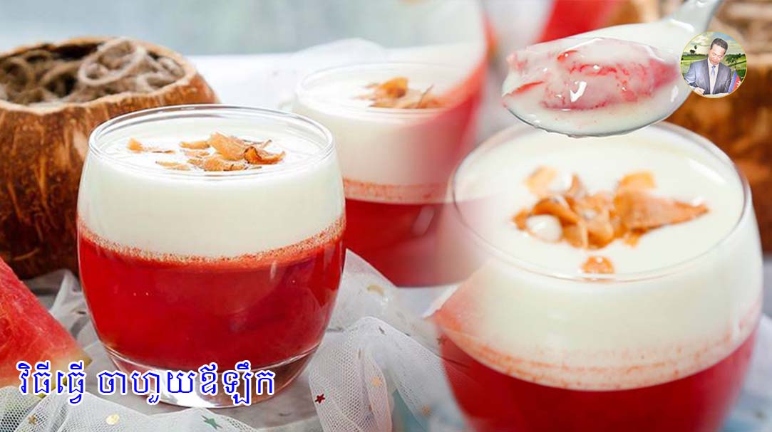 -បន្ទាប់មកយកទឹកដោះគោជូចាក់ចូលកែវចាហួយអោយពេញ ដាក់តំណប់ដូងពីលើជាការស្រេច