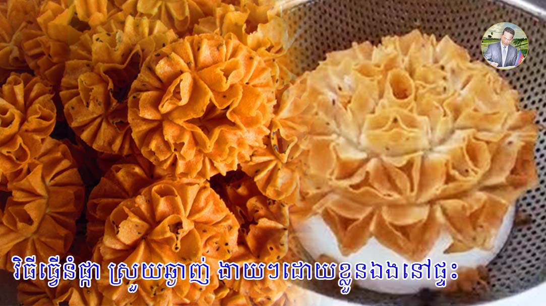 -ត្រាំខ្លាញ់រួច យកពុម្ពជ្រលក់ក្នុងម្សៅកូររួច នោះវាជាប់ពុម្ព រួចលើកយកបំពងតែម្ដង
