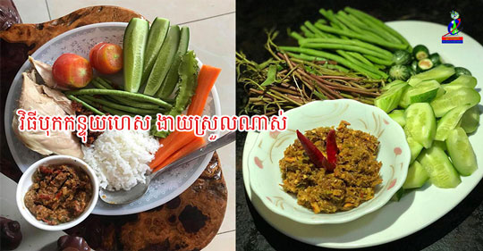 – បកខ្ទឹមសរតិចៗកុំអោយអស់សំបង រួចបុកជាមួយម្ទេស ដែលបំពងរួច បុកម៉ត់ហើយ ដាក់ត្រីឆ្អើ ដែលបុករួច ចូលក្នុងត្បាល់ បុកប្រហុកឆា អំពិលទាំងគ្រាប់ បន្ទាប់មកទៀតដាក់គ្រឿង ស្ករត្នោត រំដេងហាន់អោយល្អិត និង ម្សៅស៊ុប១ស្លាបព្រាកាហ្វេកន្លះ ជាចុងក្រោយ បំពងស្លឹកក្រូចសើចស្រគាំ ដាក់ចូលជាមួយគ្នា រួចជាស្រេច ។