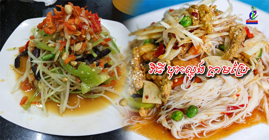 +របៀបធ្វើ៖-ដំបូងត្រូវដាក់ខ្ទឹមស និងម្ទេសស្រស់ចូលក្នុងត្បាល់ រួចបុកចូលគ្នា បន្ទាប់មកដាក់កាពិ ស្ករស និងប្រហុកចូលបុកចូលគ្នាឱ្យសព្វ សឹមច្របាច់ក្រូចឆ្មារចូល រួចកូរឱ្យរលាយចូលគ្នា។ ដាក់សណ្តែកកួរ ត្រកួន និង