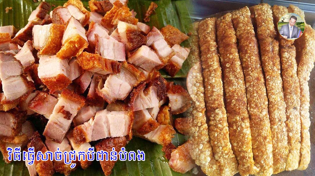 -ទម្លាក់សាច់ជ្រូកស្ងោរ ទៅក្នុងខ្ទះដែលមានខ្លាញ់ក្តៅនោះ បំពងអោយក្រឡោតស្បែក ឡើងក្រហម