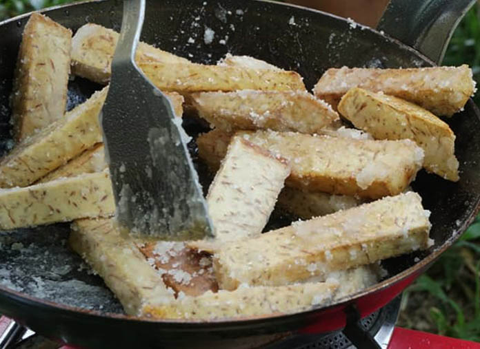 ២.ដាំខ្ទះដាក់ប្រេងចូល ដាក់ត្រាវចូលបំពងឲ្យក្រៀមល្មម រួចស្រង់ទុកឲ្យស្រស់ប្រេង