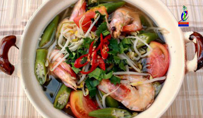 គ្រឿងផ្សំ៖ បង្គា ៤០០ក្រាម (បកសំបក ឬមិនបកក៏បាន), ប៉េងប៉ោះ ២០០ក្រាម, ម្នាស់ ២០០ក្រាម, សណ្តែកបណ្តុះ ១កូនចានចង្កឹះ, ពោតបារាំង ៥-៦ផ្លែ, ខ្ទឹមសចិញ្រ្ចាំ ១ស្លាបព្រាបាយ, ទឹកអំពិលទុំ ២ស្លាបព្រាបាយ លាយជាមួយទឹក ៤ស្លាបព្រាបាយ, អំបិលបន្តិច, ទឹកត្រីបន្តិច, ទឹក ៨០០មីលីលីត្រ, ស្លឹកខ្ទឹម, ម្អម។