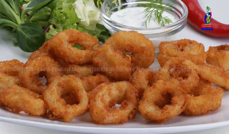 គ្រឿងផ្សំ៖ មឹក ១គីឡូធំៗល្មម, ស៊ុត ១-២គ្រាប់ (វាយបញ្ចូលគ្នា), ម្សៅបំពង ១កូនចានចង្កឹះកន្លះ, កំទេចនំបុ័ង (កញ្ចប់អាចរកទិញបាន) ២កូនចានចង្កឹះ, អំបិល បន្តិច, ម្រេចម៉ត់ បន្តិច, ប្រេងសម្រាប់បំពង។