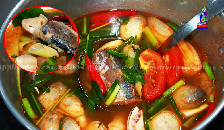 គ្រឿងផ្សំ៖ ត្រីខ ២កំប៉ុង, ផ្សិតចំបើង ១០០ក្រាម (មួយពុះជាពីរ), ទឹក ១កូនចានចង្កឹះ, រំដេង ៣ដុំ ហាន់ជាបន្ទះ, គល់ស្លឹកគ្រៃ ១គល់ កាត់ខ្លីៗ, ខ្ទឹមក្រហម ១ដុំ ហាន់ស្តើងៗ, ស្លឹកក្រូចសើច ២សន្លឹក, ម្ទេស ២-៣គ្រាប់ ដំឲ្យសំប៉ែត, ស្ករស ១ស្លាបព្រាកាហ្វេ, ទឹកត្រី ២ស្លាបព្រាបាយ, ទឹកក្រូចឆ្មារ ៣ស្លាបព្រាបាយ, ស្លឹកខ្ទឹម ឬស្លឹកជីរណា ហាន់។