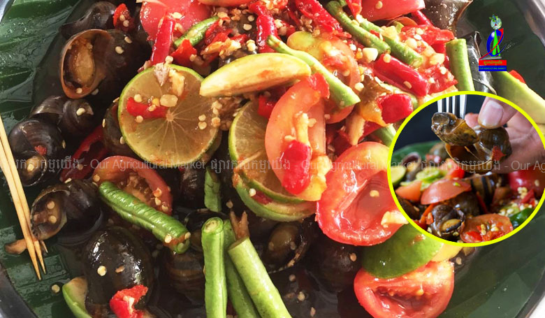 ២.បន្ទាប់មកដាក់ប៉េងប៉ោះ, សណ្តែកកួរ និងខ្យងចូលច្របល់ចូលគ្នាឲ្យសព្វ រួចដាក់ជីររណាចូលច្របល់ចូលគ្នា ហើយដួសដាក់ចានជាការស្រេច។ សម្រាប់ម្ទេស និងក្រូចឆ្មារដែលធ្វើឲ្យរសជាតិហឹរជូរ អាចថែមថយតាមចំណូលចិត្តរបស់អ្នកបាន៕ ចុចមើលវីដេអូពីវិធីធ្វើនៅខាងក្រោម៖